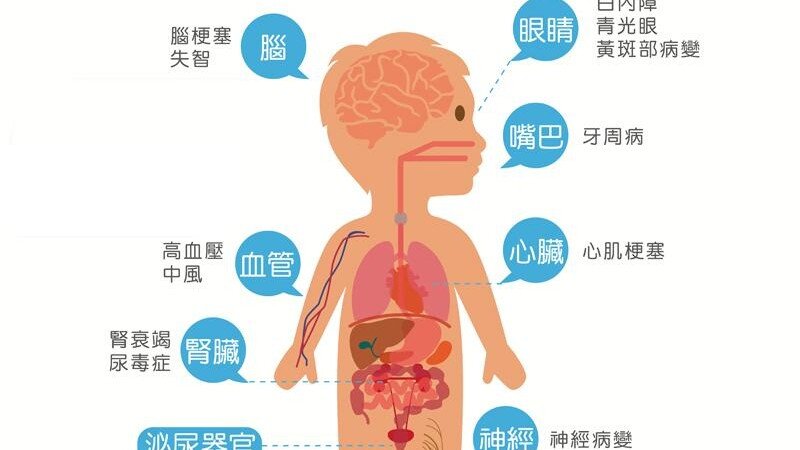 糖尿病人的血糖未控制好,猶如器官浸泡在含糖水的血液裡,容易產生併發症,且併發症的早期症狀並