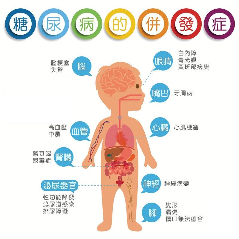 糖尿病人的血糖未控制好,猶如器官浸泡在含糖水的血液裡,容易產生併發症,且併發症的早期症狀並不明顯,容易被忽略。長期血糖控制不良及疾病的進展,全身大、小血管及神經系統等,會逐漸產生病變,而這些病變,往往是不可逆的(即無法恢復原來的狀態)!